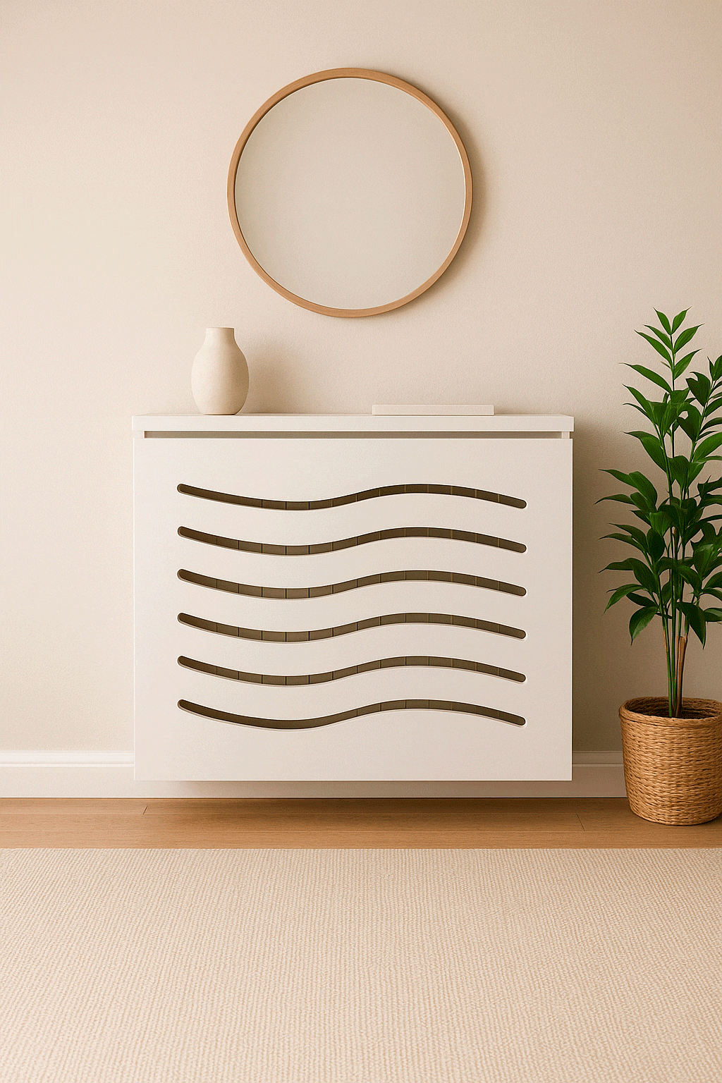 Este modelo de cubreradiador flotante es ideal para viviendas modernas, pisos pequeños donde se busca optimizar el espacio, y hogares donde la limpieza fácil es prioritaria. Su diseño atemporal se integra perfectamente en salones, dormitorios, pasillos y recibidores.